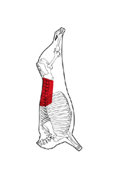 Striploin is prepared from a Hindquarter by a cut at the lumbosacral junction to the ventral portion of the Flank. The Flank is removed at a specified distance from the eye muscle at both cranial and caudal ends.