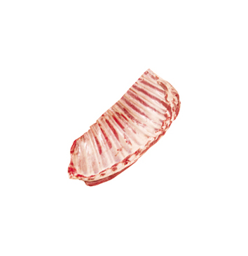 Rib Set – Full is prepared from a Side and consists of the residual rib portions and attached muscles after the removal of the major primals – Leg, Loin, Neck, Shank and Oyster Shoulder. The Breast and Flap can be removed by a cut along the costal cartilage and rib joints or by removing the Breast and Flap along the standard cutting line.