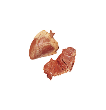 Heart is removed from the pericardium and the arteries, veins and fat cap is trimmed from the base of the heart.