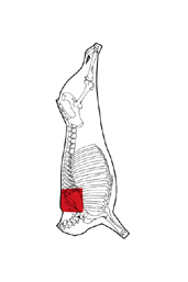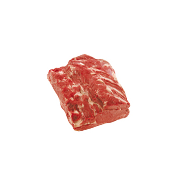 Chuck Roll is prepared from a Chuck (item 2260) by the removal of the neck between the 5th and 6th cervical vertebra parallel to the caudal cutting line. The ventral cutting line is approximately 75mm from the eye muscle (M. longissimus dorsi) and parallel to the vertebral column to the 1st rib. The M. trapezius and the M. rhomboideus are removed and the undercut (M. subscapularis) remains firmly attached.